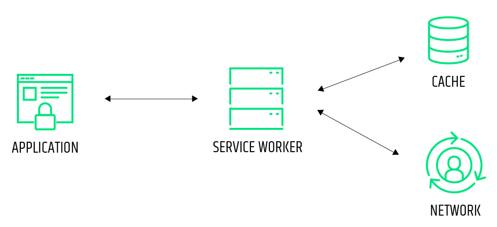 Service Worker to specjalny skrypt JS (standardowego języka aplikacji webowych, obok wspomagających HTML i CSS), który pośredniczy między aplikacją a przeglądarką. Może on zbierać informacje o kliencie, odpowiada za zapisywanie po stronie przeglądarki danych możliwych do ponownego wykorzystania (pliki, treści, etc), oraz umożliwia pracę offline.
