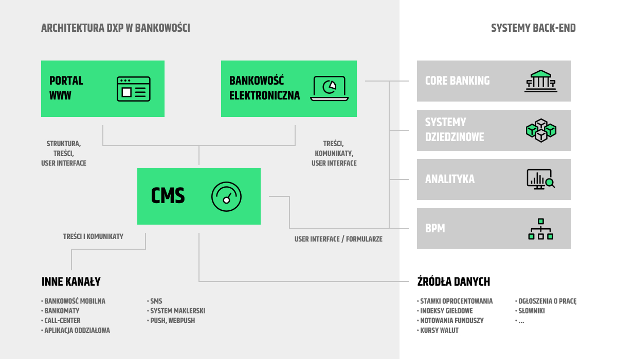 W sektorze bankowości rozwiązania IT również ewoluują w kierunku architektury DXP. Portal publiczny banku i jego system CMS, stają się źródłem treści dla innych kanałów i aplikacji. Integrując portal z systemem bankowości internetowej, możemy w ramach tego ostatniego prezentować treści informacyjne przeznaczone dla użytkowników zalogowanych. Podobne rozwiązania stosowane są dla aplikacji mobilnej banków.