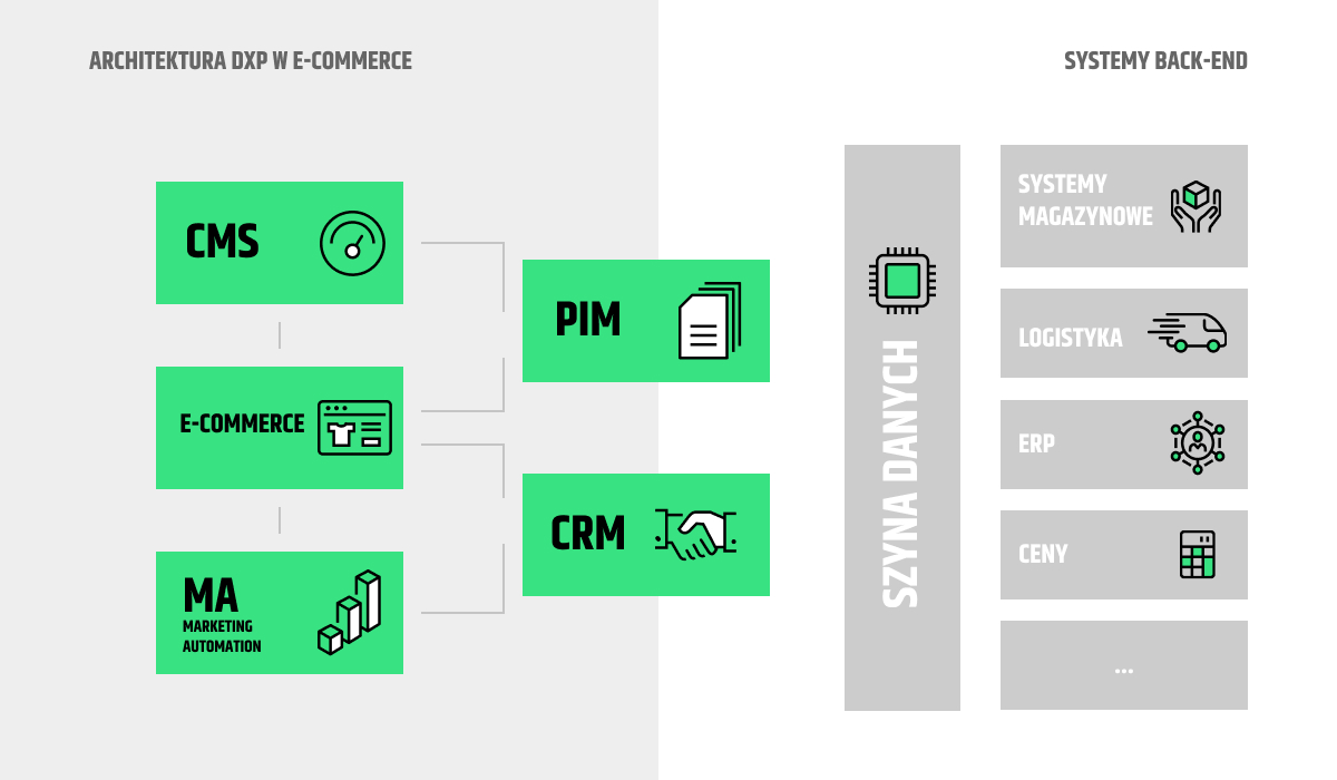 - Wiodącą platformą zapewniającą user experience jest platforma e-commerce, zaś CMS funkcjonuje w modelu headless, serwując dobrze ustrukturyzowane treści do frontu e-commerce. W takiej architekturze CMS jest jedynie źródłem treści i nie dostarcza mechanizmów tworzenia experience.