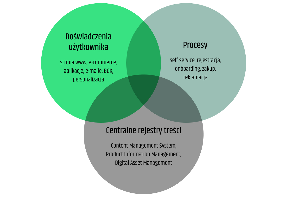 - treści: staje się centralnym hubem (zbiorem) treści, z którego serwowane są one do różnych kanałów i aplikacji.