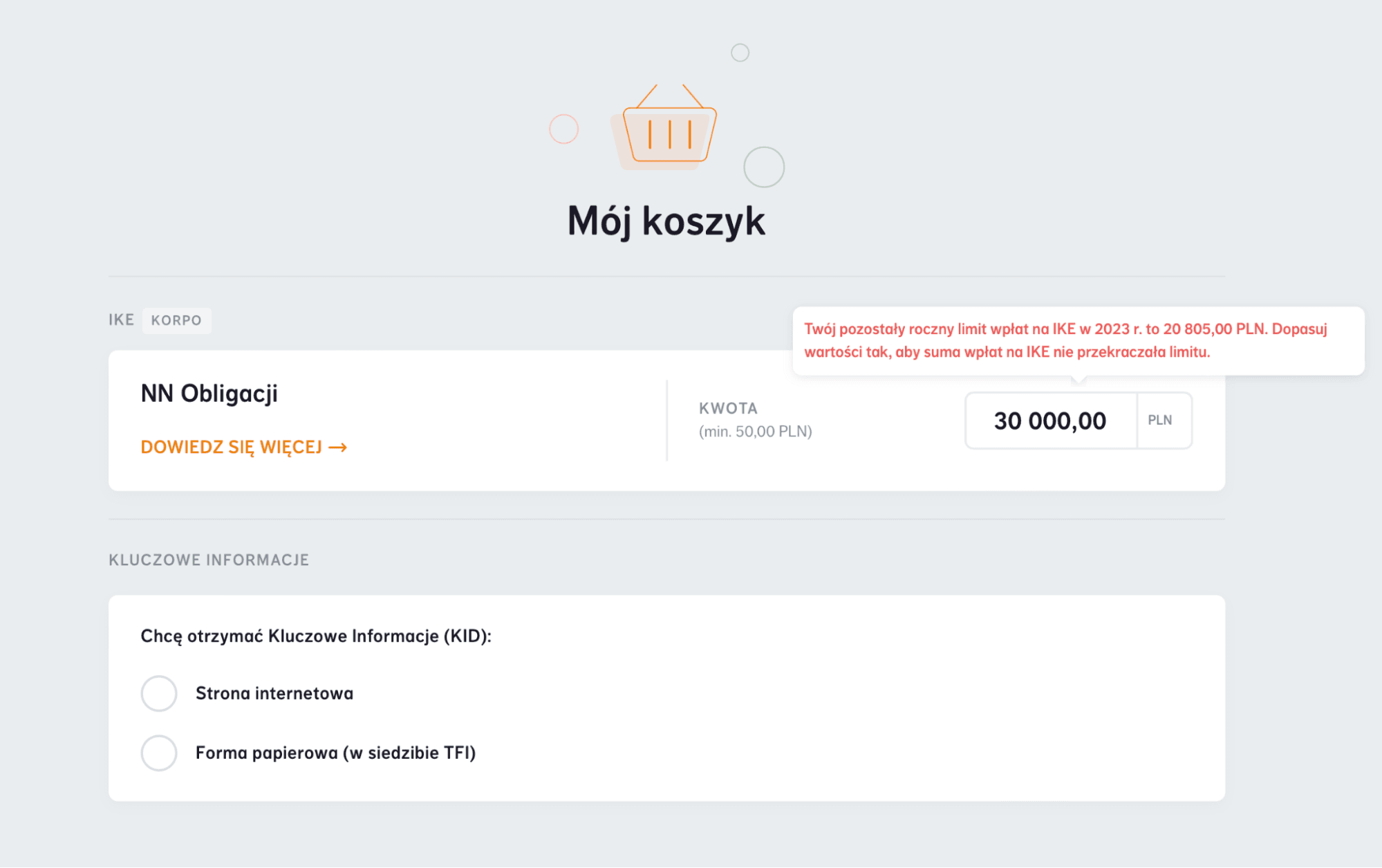 Zacznijmy od podobieństw. Przede wszystkim system służy do kupowania produktów finansowych, takich jak inwestycje w fundusze inwestycyjne i plany emerytalne. System, tak jak w e-commerce, prezentuje ich pełen katalog oraz stosuje konwencję typu „Koszyk”, do której Klienci są przyzwyczajeni z klasycznych rozwiązań e-commerce.