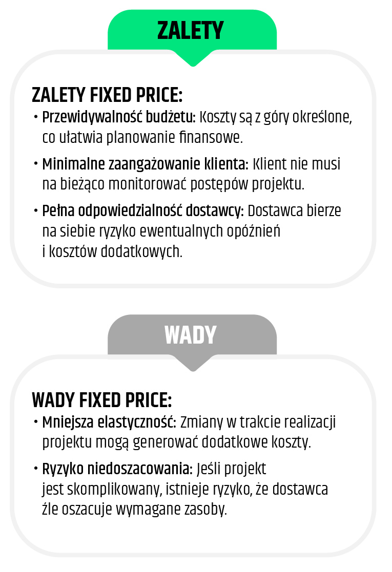 Jednym z głównych atutów Fixed Price jest to, że dostawca przejmuje pełną odpowiedzialność za realizację projektu zgodnie z ustalonym harmonogramem i budżetem. Dla klientów, którzy cenią sobie stabilność oraz przewidywalność, jest to model, który minimalizuje ryzyko finansowe i operacyjne, a jednocześnie pozwala skupić się na innych aspektach działalności biznesowej.