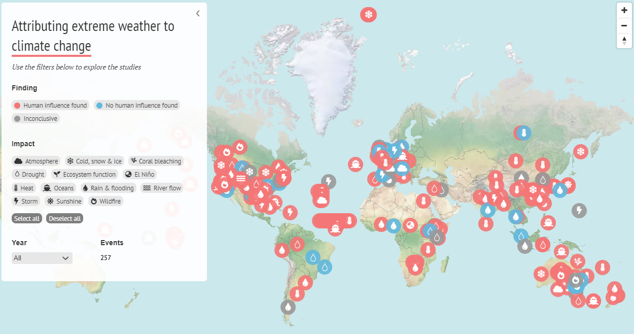 Serwis Carbonbrief w sugestywny sposób prezentuje mapę ekstremalnych zjawisk pogodowych będących konsekwencją zmian klimatycznych.