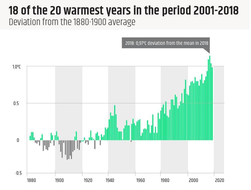Jak podaje największy na świecie reasekurator, firma Munich Re, wszystkie 18 lat od roku 2001 należało do 20 najcieplejszych lat w historii pomiarów.