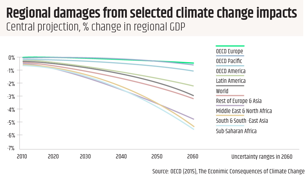 Całość skutków odbije się potężnie na gospodarkach poszczególnych Państw. W szczególności największe straty dotkną ubogie kraje Afryki subsaharyjskiej i Azji - kraje, które emitują mało gazów cieplarnianych i de facto w najmniejszym stopniu przyczyniły się do kryzysu: