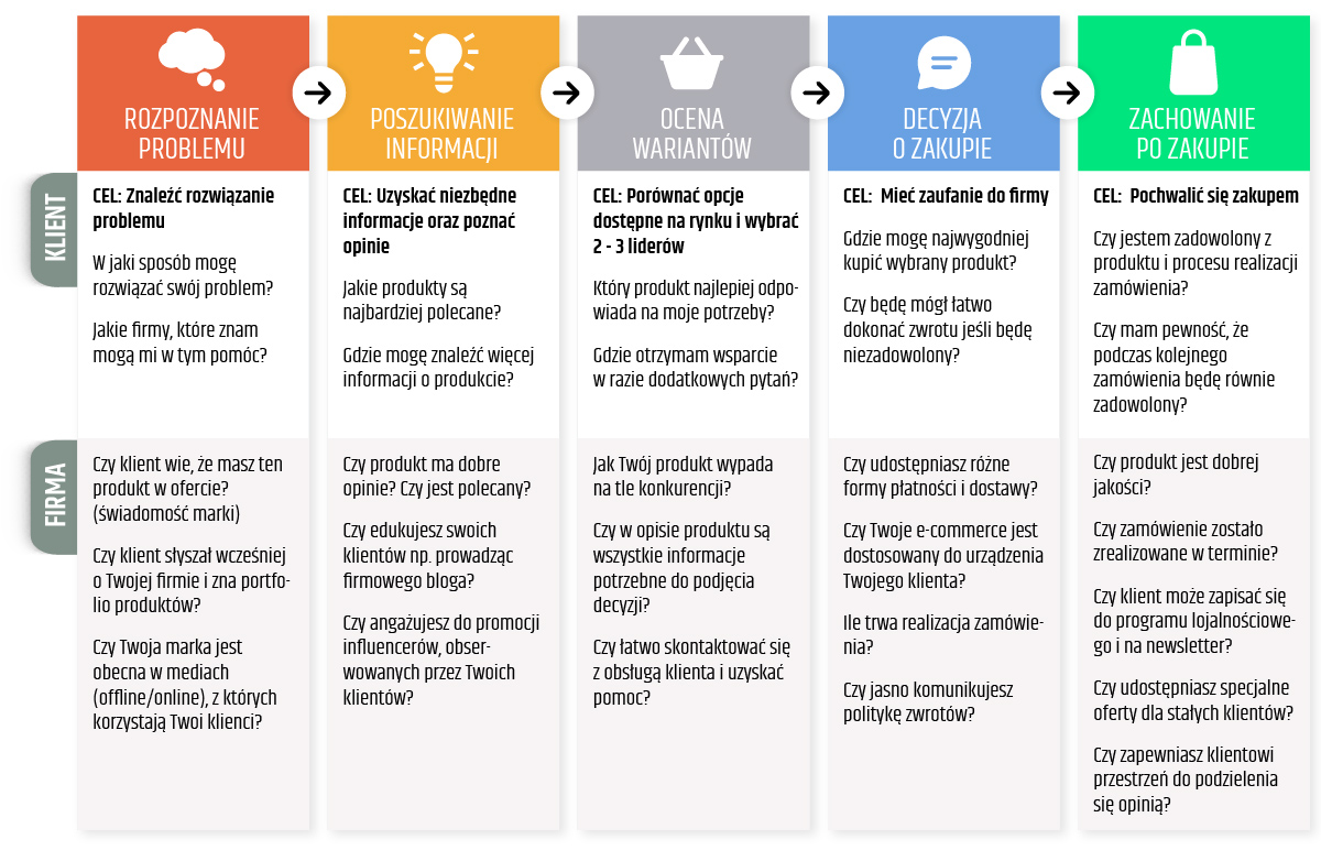 Ścieżkę zakupową możesz określić badając zachowania Twoich obecnych klientów. Dzięki temu zrozumiesz, jak wygląda ich proces zakupowy, jakie problemy napotykają i czego potrzebują, aby osiągnąć cel i sfinalizować zakup oraz z satysfakcją użytkować produkt lub korzystać z usługi. Pozwoli Ci to spojrzeć na cały proces z perspektywy konsumenta i łatwiej zidentyfikować krytyczne momenty, które kształtują jego doświadczenia. W efekcie będziesz mógł opracować spersonalizowaną komunikację marketingową i budować klientocentryczne podejście wśród pracowników Twojej firmy.