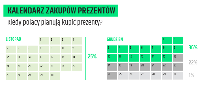 Z badań przeprowadzonych przez Deloitte Digital wynika, że zaopatrujemy się w prezenty świąteczne już od 1 listopada (!). Natomiast większość ruchu (58%) przypada standardowo na okres 01.12 do 24.12 - to właśnie jest najgorętszy okres dla e-commerce, kiedy oblężenie serwisów wzrasta każdego dnia.