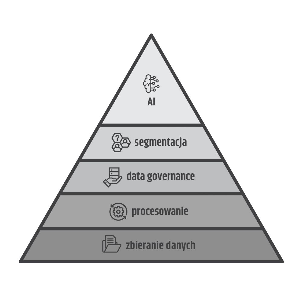 Fundamentem dla wdrożenia sztucznej inteligencji są duże zbiory danych. Jim Marous obrazuje ten problem w formie piramidy Maslowa: u podstawy, tam, gdzie znajdują się najbardziej bazowe potrzeby, lokuje się zbieranie danych. Następne warstwy piramidy to ich procesowanie, data governance, segmentacja, a dopiero jej zwieńczeniem jest sztuczna inteligencja. To właśnie duże ilości danych dostarczają algorytmom materiału do uczenia się.