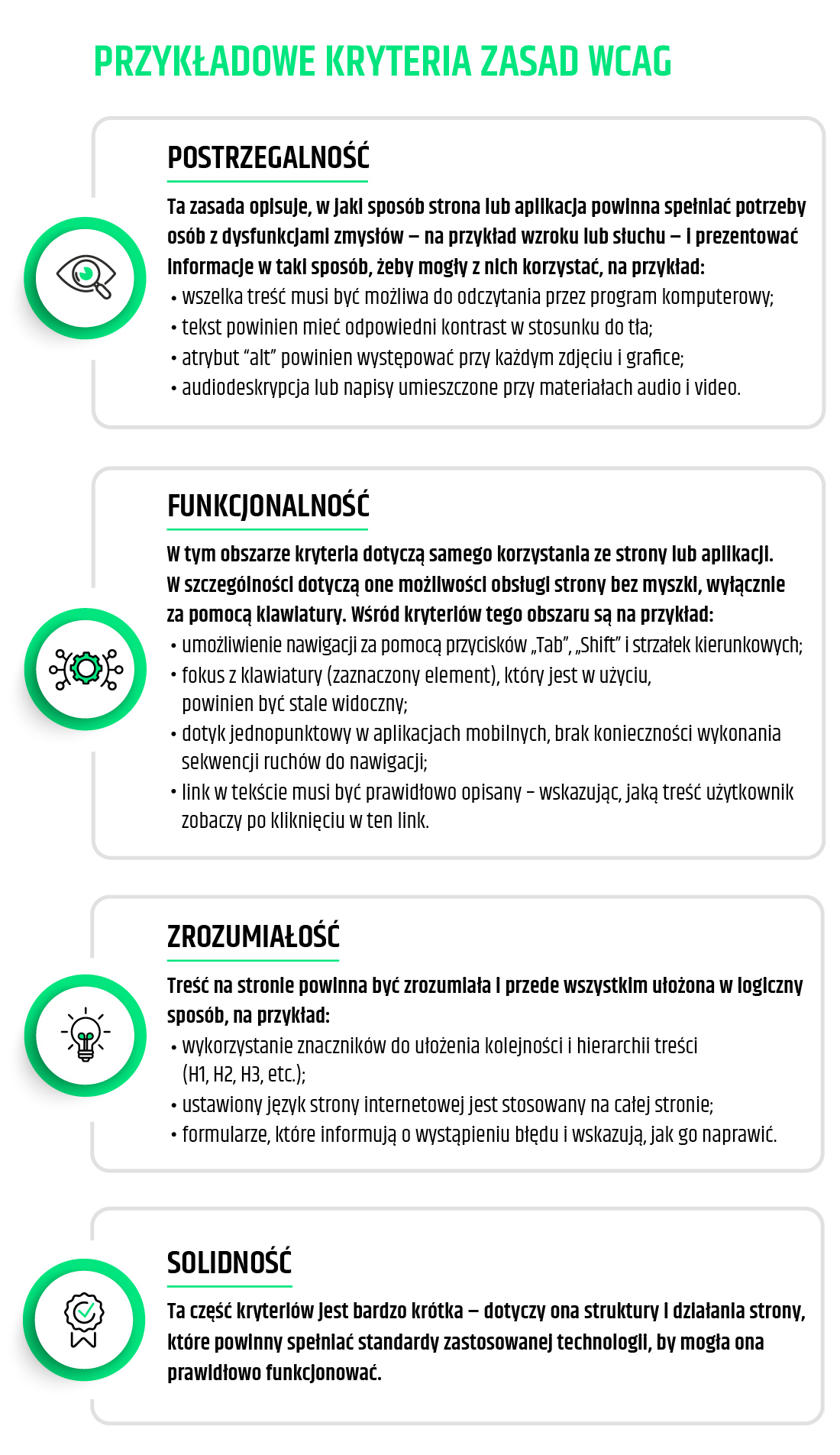 W tych obszarach znajdują się kryteria, które są podzielone na trzy poziomy: A, AA oraz AAA. Spełnienie wszystkich wymagań z poziomów A oraz AA pozwala spełnić obowiązki nakładane przez Europejski Akt o Dostępności Cyfrowej, chociaż oczywiście warto dążyć do spełnienia również kryteriów z poziomu AAA.