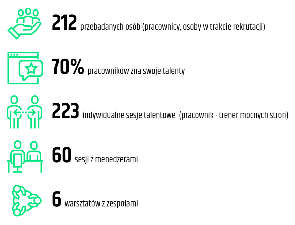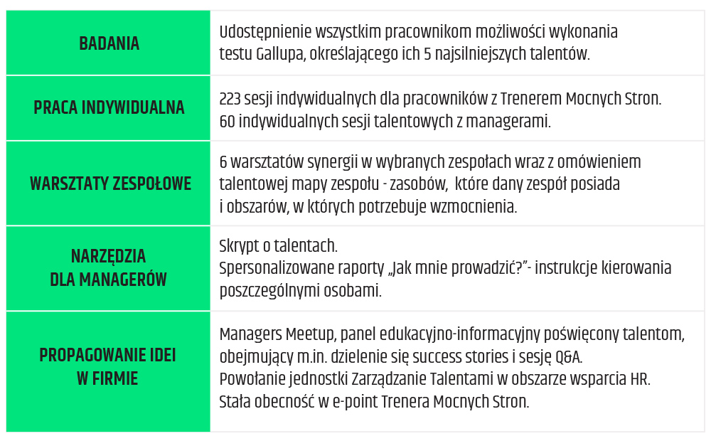 - przeprowadzenie działań edukacyjnych, które miały spopularyzować podejście mocnych stron i narzędzia CliftonStrengths wewnątrz firmy,