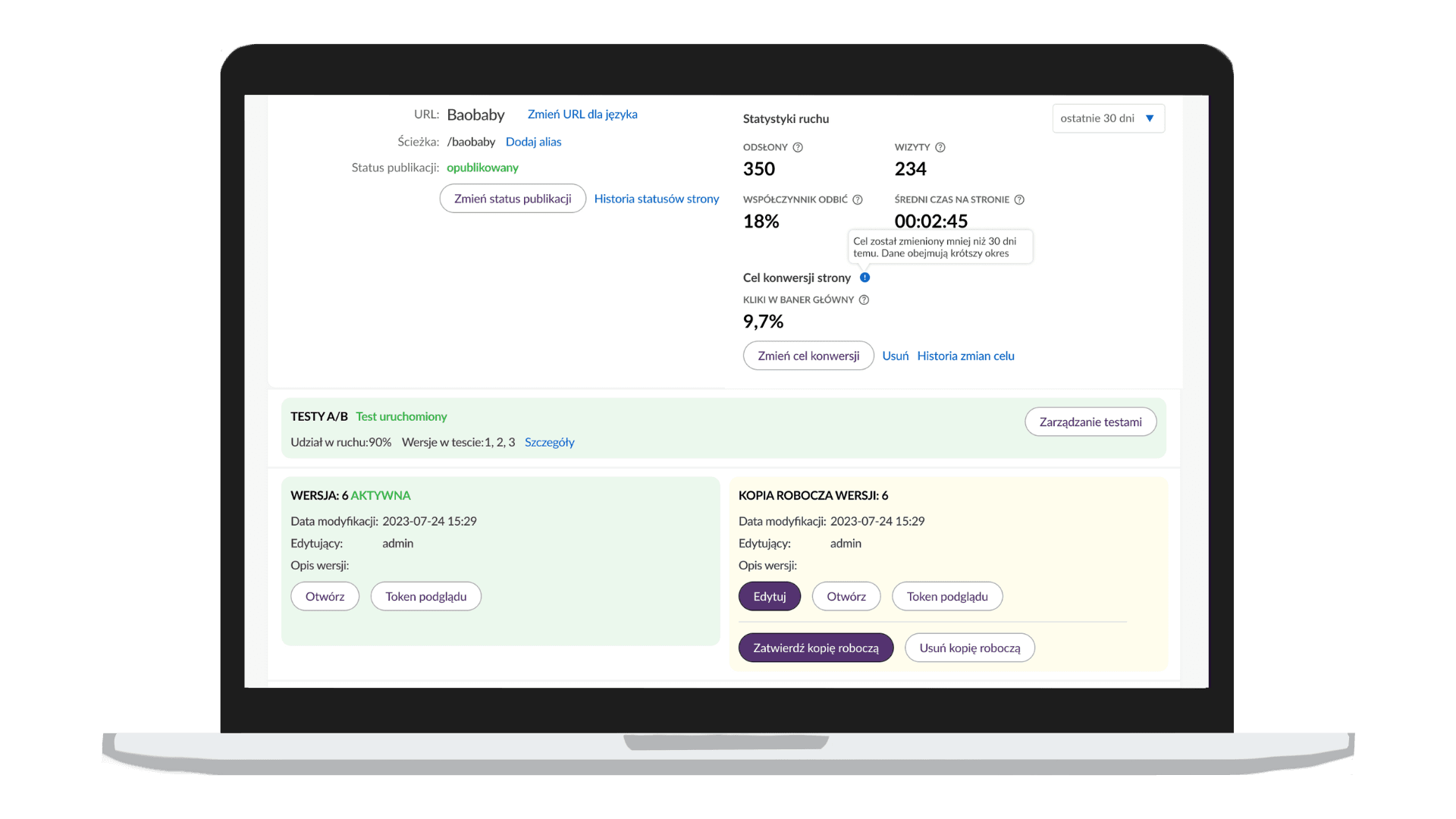 Automatyzacja i harmonogram: Ustawiaj czas startu i zakończenia testów. System sam opublikuje zwycięską wersję po uzyskaniu istotności statystycznej.